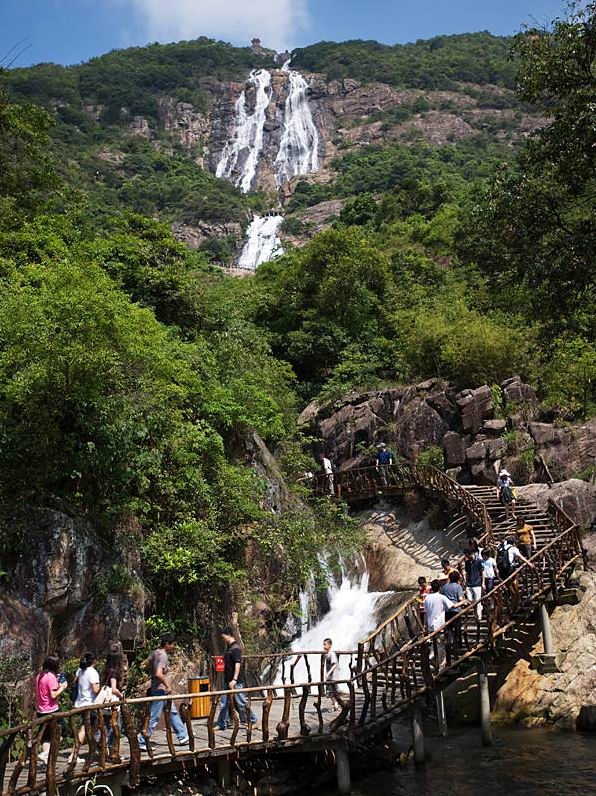 瀑布下的親水步道上悠游漫步,是接近自然接近仙瀑的更輕松方式。親水步道的入口與“天南一梯"的第2 9 9級(jí)相接,通至第1 2 9 9級(jí)的觀瀑臺(tái),全長(zhǎng)6 6 6米,是一條天然的木棧道。走在上面,游人可以一邊眺望白水仙瀑的翩翩美態(tài),一邊前行,任潺潺的流水有如活潑歡快的音符般在腳下跳躍奔流。