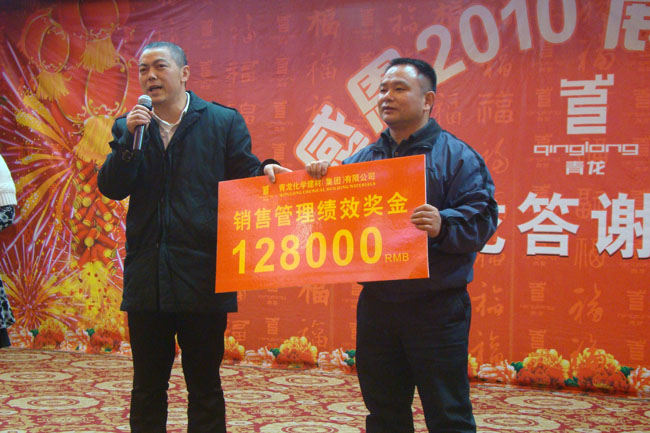 會(huì)上,青龍公司重點(diǎn)表彰了優(yōu)秀代理商代表和企業(yè)優(yōu)秀員工,其中對廣西青龍公司曾知博經(jīng)理個(gè)人銷售管理績效獎(jiǎng)金高達(dá)12.8萬元,曾總發(fā)表感言說,青龍公司是個(gè)一個(gè)重信譽(yù),講誠信,有實(shí)力的企業(yè),非常感謝青龍能給自己這樣一個(gè)實(shí)現(xiàn)自我價(jià)值的平臺(tái),并表示愿意和廣西青龍廣大同仁一起努力拼搏,2011年再創(chuàng)輝煌。