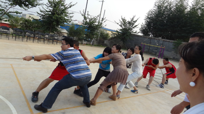 籃球賽后,雙方還進行了激烈刺激的拔河比賽,雙方成員派出4男4女進行拔河比賽,參賽隊員,啦啦隊、圍觀者人頭攢動,一派熱鬧的景象。隨著一聲哨響,兩邊隊員開始奮力向各自的方向拉,場外的啦啦隊們扯著嗓子吶喊助威,中間的紅色繩子開始搖擺,忽左忽右,僵持中,隊員臉上個個漲得通紅,經(jīng)過一番激烈的拉扯,紅繩之后到了金鷹隊這邊,勝利的喜悅彌漫了整個工廠的上空,不管是輸家還是贏家,大伙都玩得不亦樂乎。