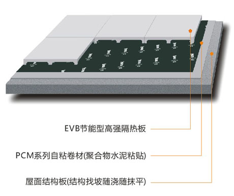 屋面防水保溫隔熱一體化系統(tǒng)的結(jié)構(gòu)層次為結(jié)構(gòu)層——青龍PCM系列自粘防水卷材——EVB節(jié)能型高強(qiáng)隔熱板(如下圖),大大減少傳統(tǒng)防水保溫屋面構(gòu)造層次,減輕了屋面載荷,而且施工十分簡(jiǎn)單,屋面防水維修非常方便,綜合性?xún)r(jià)比高,完全滿(mǎn)足屋面熱工指標(biāo)計(jì)算要求,防水、隔熱效果顯著,防火等級(jí)為A級(jí)。