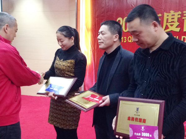 年會還對2013年度青龍集團優(yōu)秀代理商進行了表彰獎勵,并頌發(fā)“金牌代理”匾,獲得表彰的代理商也就自己市場開拓經(jīng)驗與參加年會的代理朋友進行了分享。