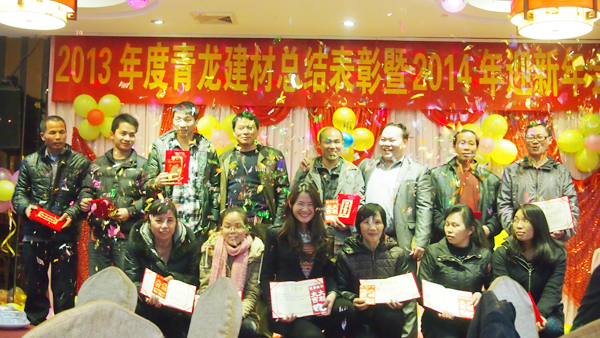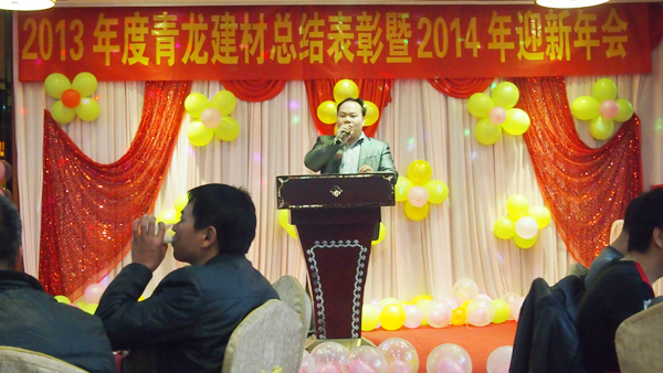 晚宴上,青龍廣西分公司韋流武先生代表集團董事長宋總致晚宴開幕辭并送上新年祝福。韋經(jīng)理總結(jié)了2013年青龍廣西化學(xué)建材的發(fā)展歷程,肯定了2013年所取得的成績,并對2014年寄予了美好展望。之后對2013年青龍廣西化學(xué)建材表現(xiàn)優(yōu)異的員工進行表彰,鼓勵大家向他們學(xué)習(xí),繼續(xù)為生產(chǎn)中國較好的防水材料而奮斗。