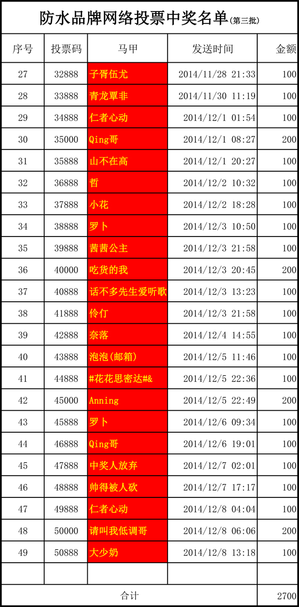 第三批中獎(jiǎng)名單公布如下:子胥伍尤、青龍覃非、仁者心動(dòng)、Qing哥、山不在高、哲、小花、羅卜、茜茜公主、吃貨的我、話不多先生愛(ài)聽(tīng)歌、伶仃、奈落、泡泡(郵箱)、#花花思密達(dá)#&、Anning、羅卜、Qing哥、帥得被人砍、仁者心動(dòng)、請(qǐng)叫我低調(diào)哥、大少奶。恭喜他們,也請(qǐng)大家繼續(xù)支持青龍,為青龍投票!