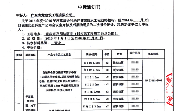 青龍集團中標金科地產防水工程戰(zhàn)略招標