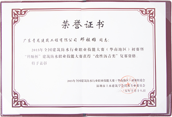 青龍公司鄧祖雄防水晉級(jí)證書