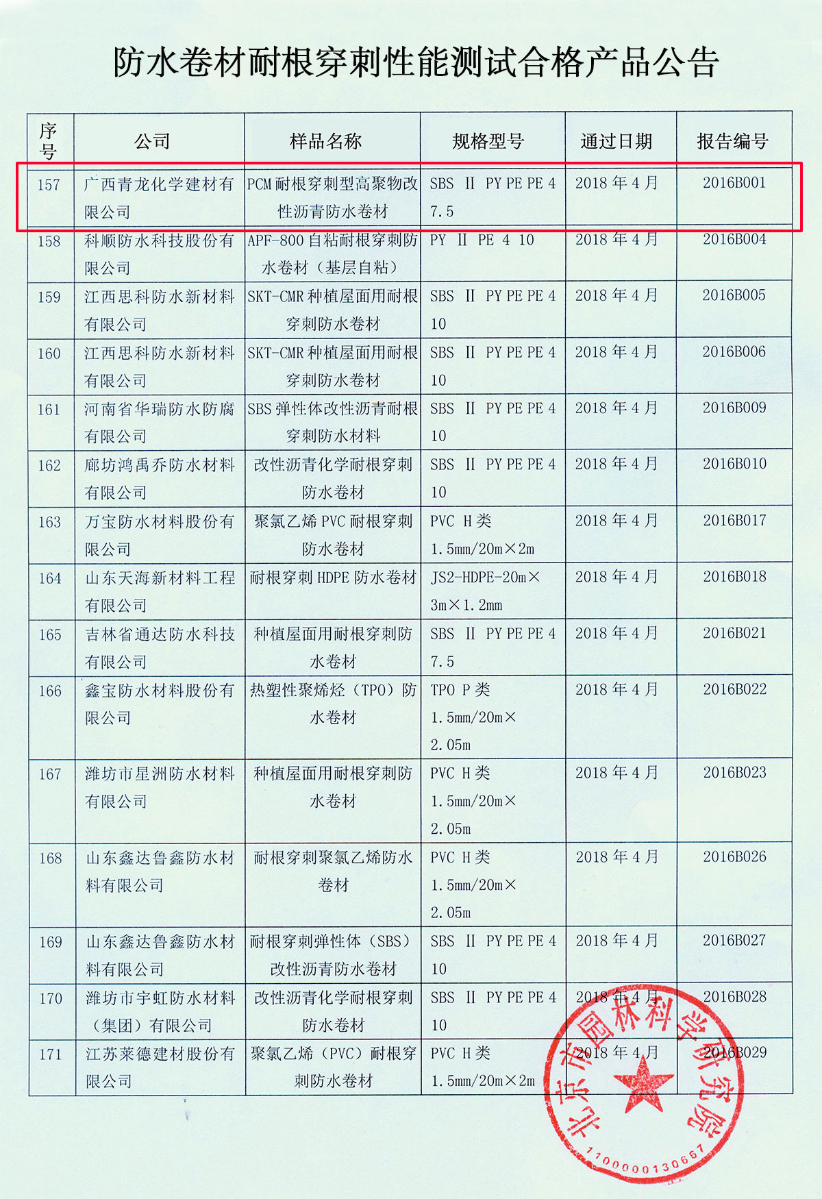 2018年5月4日,北京園林科學(xué)研究院官方網(wǎng)站發(fā)布了《防水卷材耐根穿刺性能測(cè)試合格產(chǎn)品最新公告》,廣西青龍化學(xué)建材有限公司等17家防水企業(yè)生產(chǎn)的23款防水卷材通過耐根穿刺性能專項(xiàng)測(cè)試。青龍耐根穿刺型防水卷材測(cè)試的順利通過,將可以為種植屋面客戶提供全面的安全、防水保障。