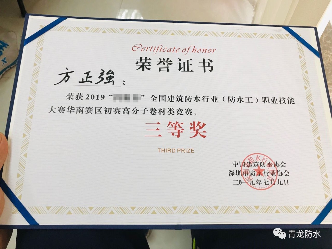 7月9日,由中國建筑防水協(xié)會、深圳市防水行業(yè)協(xié)會共同主辦的2019年全國建筑防水行業(yè)職業(yè)技能大賽(華南賽區(qū))初賽圓滿落幕,來自青龍公司工程部的方正強獲得全國建筑防水職業(yè)技能大賽三等獎的好成績。