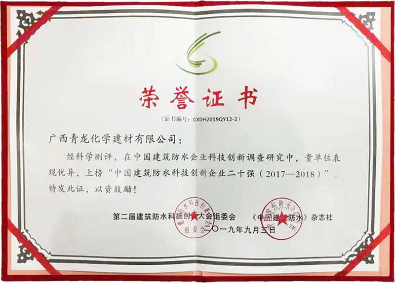 9月,第二屆建筑防水科技創(chuàng)新大會上,青龍司榮獲"中國建筑防水科技創(chuàng)新企業(yè)二十強",成為繼獲得首屆建筑防水科技創(chuàng)新大會"科技先鋒企業(yè)"和"科技先鋒人物"之后,青龍再獲"科技"類殊榮,彰顯了青龍公司強勁的科技創(chuàng)新實力和在行業(yè)的技術(shù)地位。