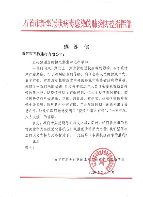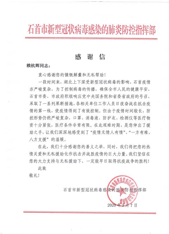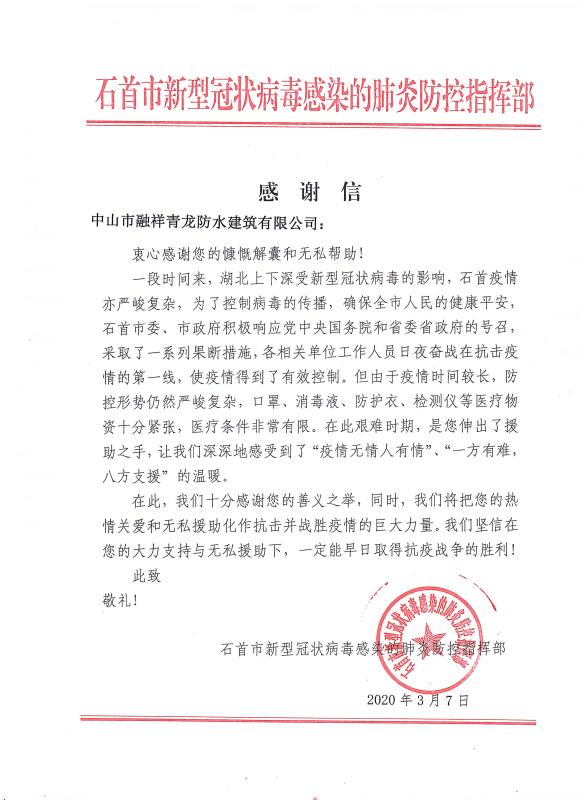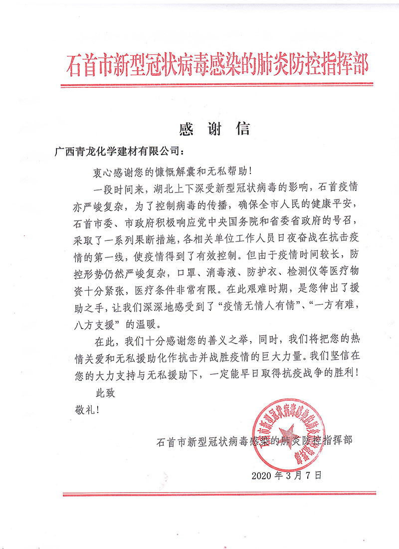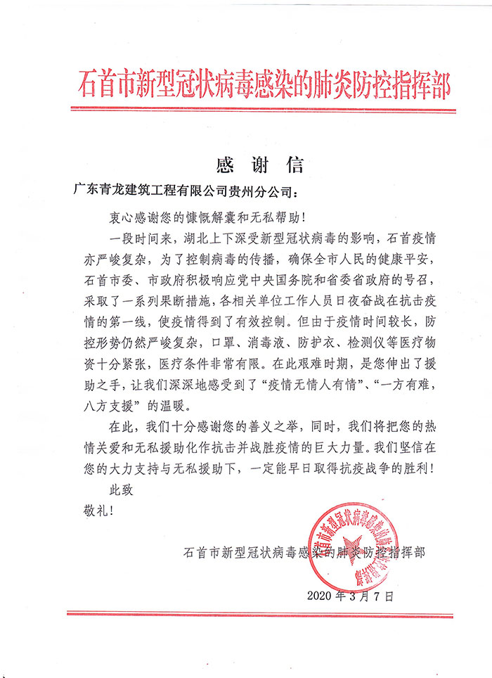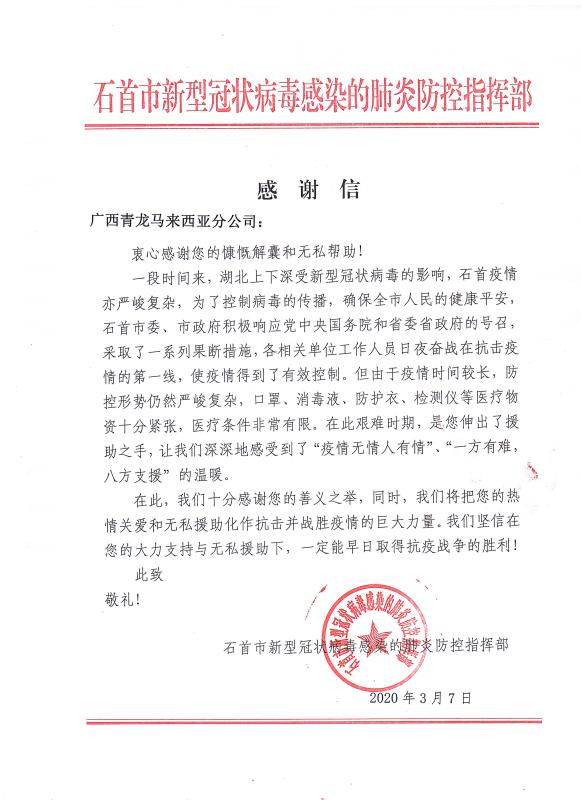 當全國疫情數(shù)據(jù)持續(xù)向好,各地復工復產(chǎn)有序進行的時候。青龍公司收到了來自湖北省石首市新型冠狀病毒感染的肺炎防控指揮部16封特殊的感謝信。