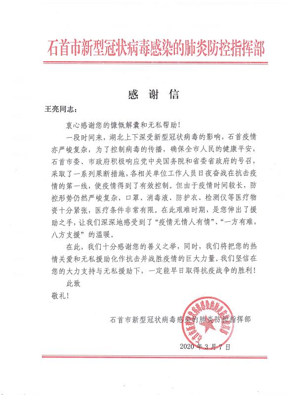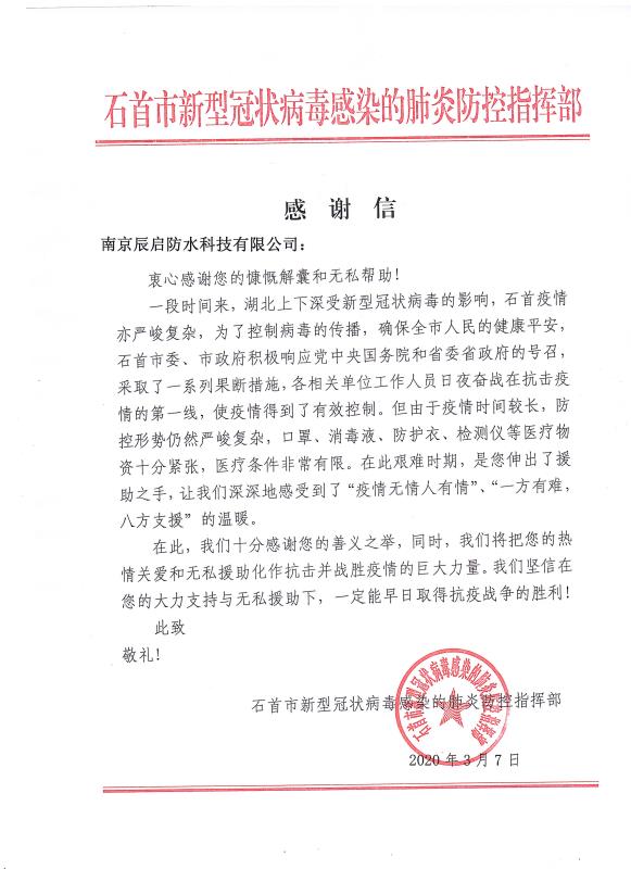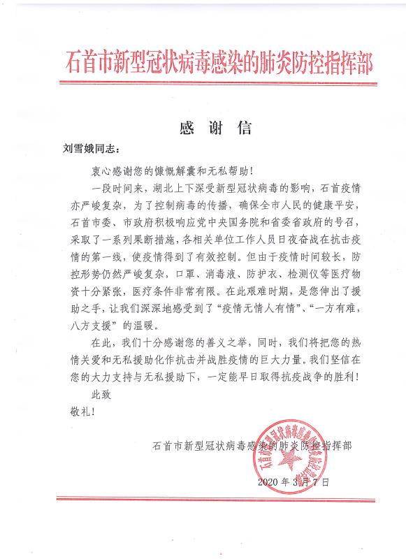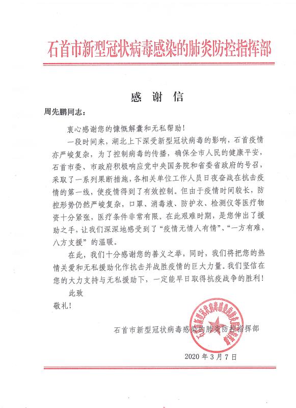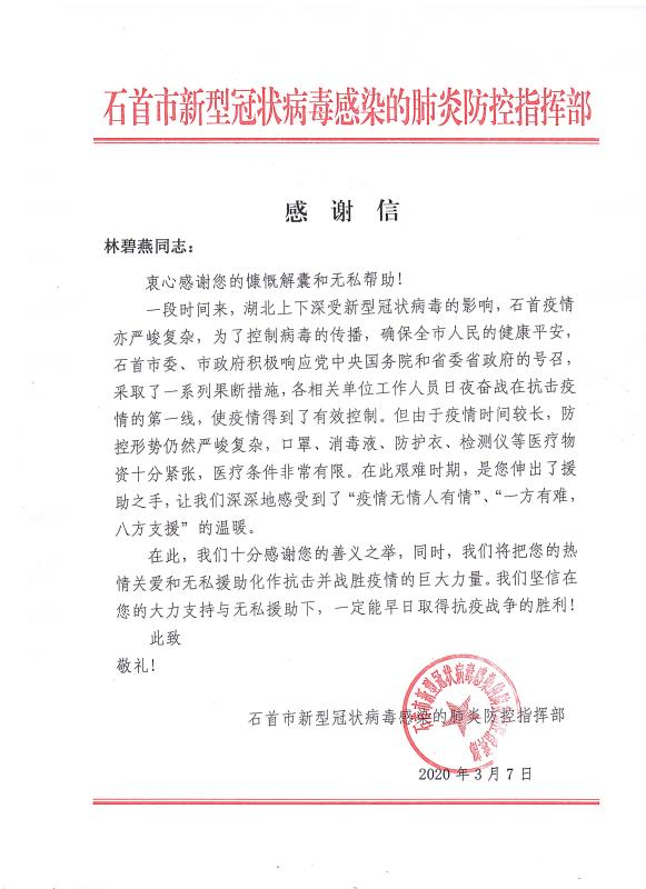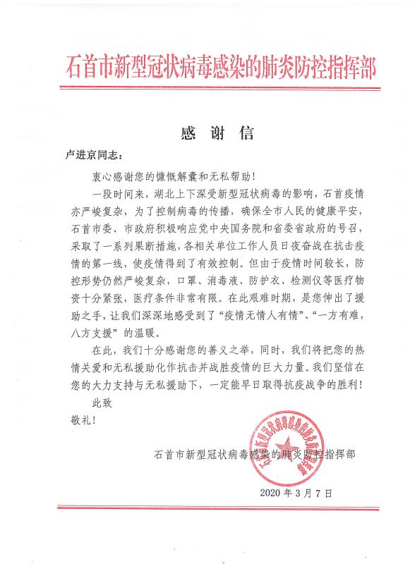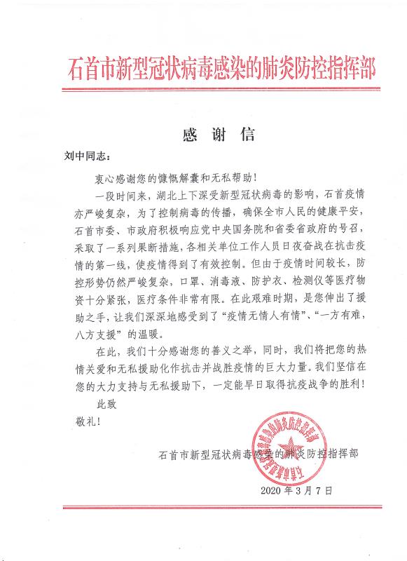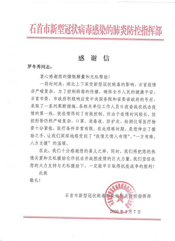 當全國疫情數(shù)據(jù)持續(xù)向好,各地復工復產(chǎn)有序進行的時候。青龍公司收到了來自湖北省石首市新型冠狀病毒感染的肺炎防控指揮部16封特殊的感謝信。