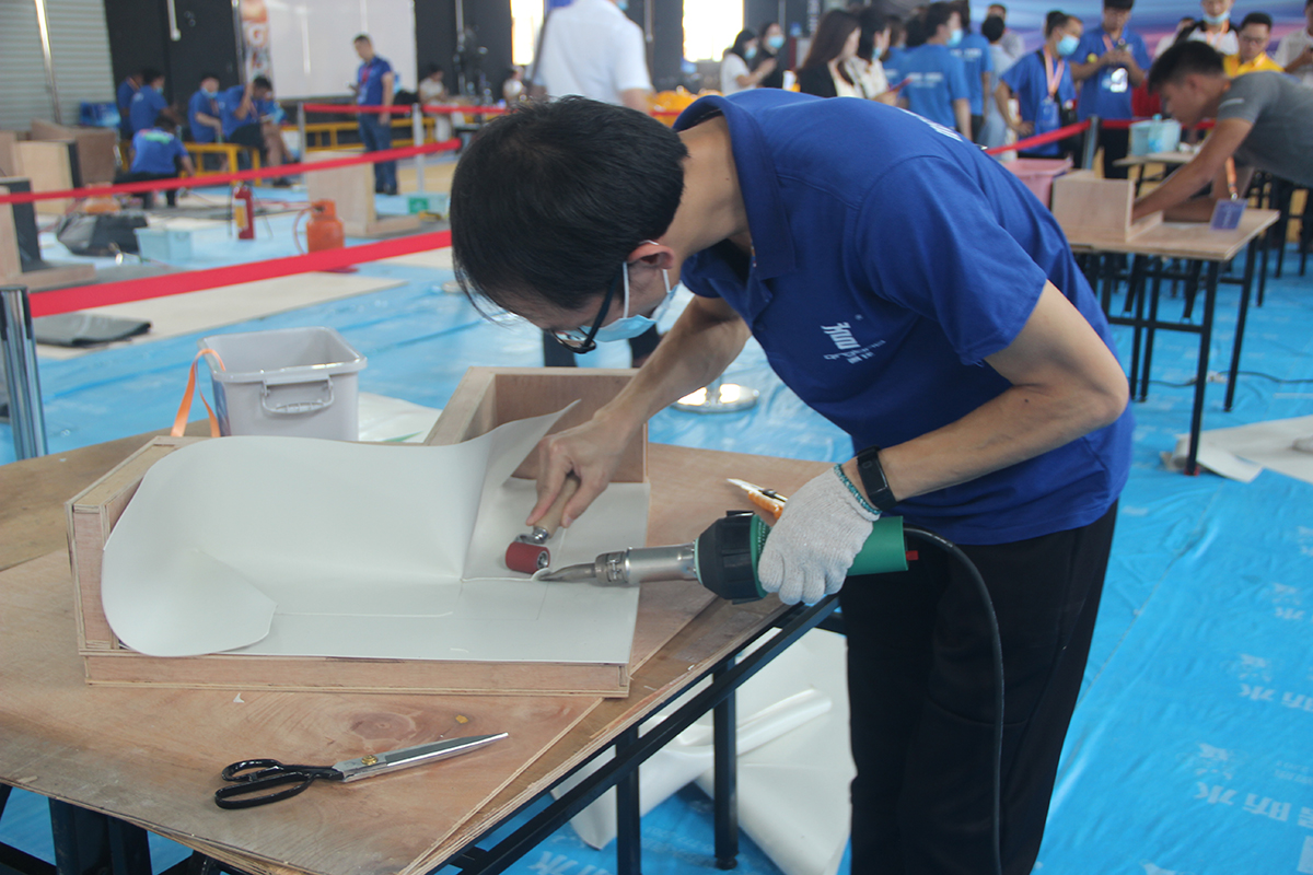 那么這邊是PVC高分子自粘膠膜,它也主要是考驗(yàn)選手的搭接,搭接不牢的話,卷材就會容易竄水。高分子類,不管是PVC、HTPE、還是TPO,它們都是同樣的施工方法。我們現(xiàn)場比賽選用的是青龍的PVC防水卷材,它的搭接原理是熱風(fēng)焊接。熱風(fēng)焊接可分單焊線和雙焊線,選手比賽也是模擬屋面項(xiàng)目,先是裁線、剪切,然后是搭接,搭接縫也不能低于6公分。因?yàn)楦叻肿硬牧系膹埩Ρ容^強(qiáng),它沒有改性瀝青材料那樣服貼,它的難度相對于SBS要稍高的。