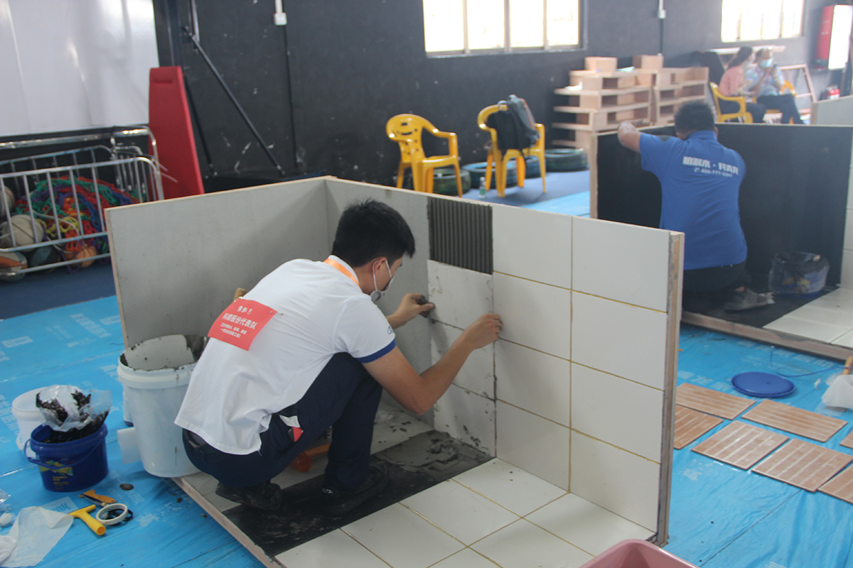 前面有一組是做衛(wèi)生間貼磚。傳統(tǒng)的認(rèn)知,大家都以為防水技能工一定是農(nóng)民工,在社會地位得不到尊重。但是在這次的比賽場,有一個(gè)有趣的現(xiàn)象,選手越來越年輕化,你看還有很多是小鮮肉、小帥哥。所以說防水技能工不是沒有技術(shù)含量的普通的農(nóng)民工,而是有技術(shù)含量,可以受到社會認(rèn)可的。包括今天的這次比賽,也是全國人社廳認(rèn)可的,如果成績優(yōu)異的選手,都會獲頒發(fā)證書的。所以說,我們的選手越來越年輕化,不用擔(dān)心青黃不接的問題。
