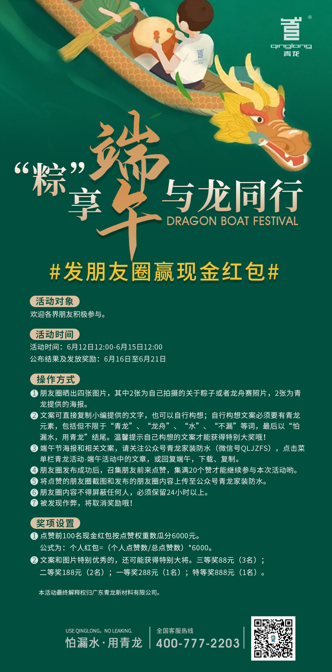 (2)文案可直接復(fù)制小編提供的文字,也可以自行構(gòu)想;自行構(gòu)想文案必須要有青龍元素,包括但不限于"青龍"、"龍舟"、"水"、"不漏"等詞,最后以"怕漏水,用青龍"結(jié)尾。(溫馨提示:自己撰寫的文案才能獲得特別大獎哦?。?/p>