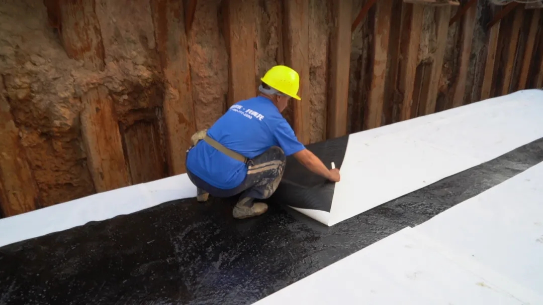 該標(biāo)段防水項目長度達到3km,底板防水設(shè)計的做法是青龍1.2mmHDPE高分子自粘膠膜帶沙粒,管廊的側(cè)墻和頂板所用的防水材料為1.2mmHDPE單面自粘膠膜。目前側(cè)墻的防水施工已經(jīng)全部完成,頂板的防水施工也將在工期內(nèi)很快完成。