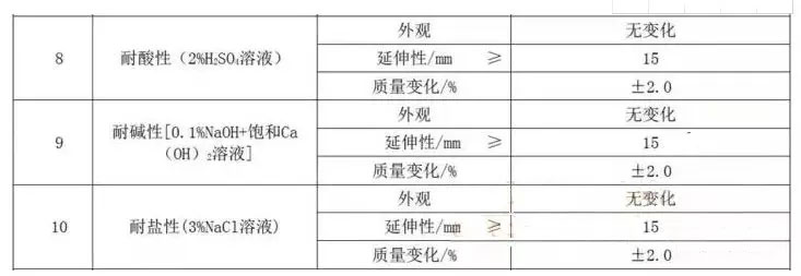 耐酸性、耐堿性、耐鹽性:耐酸、堿、鹽性反映了材料的抗腐蝕效果,通過外觀、延伸性和質(zhì)量變化來表示,標(biāo)準(zhǔn)要求如下: