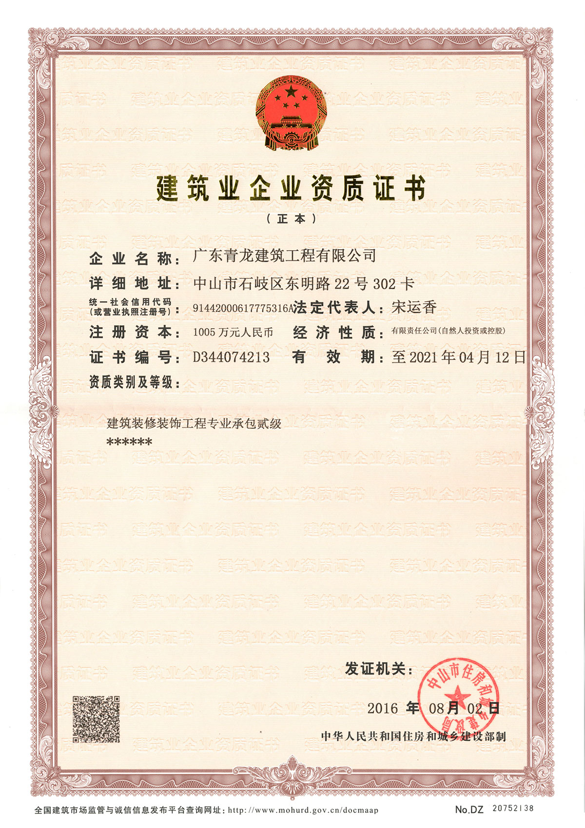 建筑裝修裝飾工程專業(yè)承包資質(zhì)對企業(yè)資產(chǎn)、企業(yè)主要人員、企業(yè)工程業(yè)績都有著非常高的要求,建筑裝修裝飾工程專業(yè)承包貳級資質(zhì)的成功取得,是對青龍實(shí)力的認(rèn)可,對于進(jìn)一步擴(kuò)大企業(yè)的品牌影響力、提升企業(yè)競爭力有著重大意義。