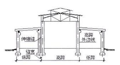高低聯(lián)跨的建筑物應(yīng)以高跨結(jié)構(gòu)外邊線為界分別計算建筑面積;其高低跨內(nèi)部連通時,其變形縫應(yīng)計算在低跨部分的面積內(nèi)。(圖4)