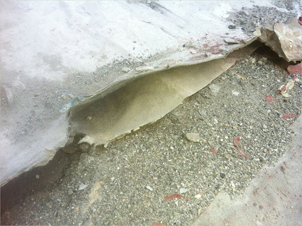 (三)在結(jié)構(gòu)沉降、溫差、震動(dòng)、氣壓差、荷載變化等各種復(fù)雜的運(yùn)行條件下,鋪裝完畢的剛性水泥涂層與聚乙丙綸卷材、混凝土基層三者之間的形變不一致,導(dǎo)致防水層開(kāi)裂、分層和脫落而失效。