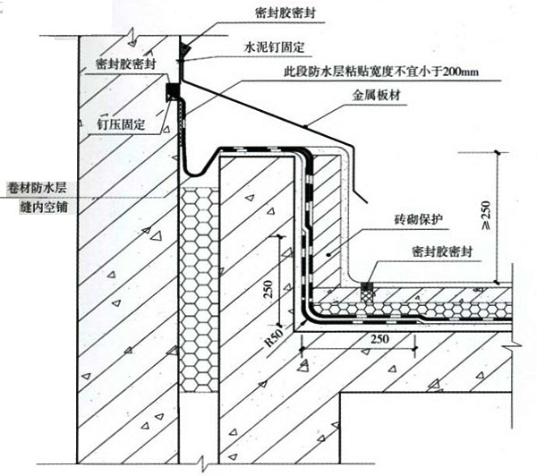 1.對變形縫的防水處理必須選用變形能力強及耐老化性能的合成高分子防水卷材,并應(yīng)具備有效的密封構(gòu)造措施。 2.屋面變形縫應(yīng)避免設(shè)計成平縫,變形縫墻應(yīng)采用≥C20混凝土澆筑,不得采用磚砌。變形縫墻體宜與屋面結(jié)構(gòu)板一起澆搗,不留施工縫。如不能一次澆搗,應(yīng)在墻體澆搗前施工縫位置嵌填5x8mm遇水膨脹密封膠。 3.在變形縫內(nèi)填背襯材料及彈性密封材料,對等高變形縫在墻頂鋪貼一條通長“U" 形防水卷材,寬度與墻面同,先貼好一面,縫中嵌入聚乙烯泡沫塑料棒作襯墊,再粘貼另一面,上面再蓋一層高分子卷材,并與防水層相連接粘牢,形成整體防水層。然后在變形縫頂部加鋼筋混凝土蓋板或金屬蓋板,混凝土蓋板接縫用密封膠嵌填密實。 4.對高低跨變形縫,則按“U"形方式鋪設(shè)卷材,卷材上方的收頭應(yīng)塞入高跨墻體預(yù)留的凹槽內(nèi),用壓條或墊片釘壓固定,凹槽上部再用金屬披水板釘壓固定。卷材收頭及金屬板均用密封材料封嚴(yán)。 5.變形縫兩側(cè)防水層應(yīng)滿粘,縱向搭接寬度不小于200mm并密封嚴(yán)密。 |