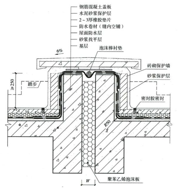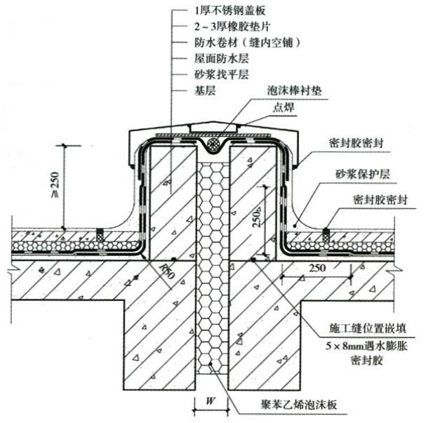 《屋面工程技術(shù)規(guī)范》 GB 50345-2012 4.11.18變形縫的防水構(gòu)造應(yīng)符合下列規(guī)定: 1.變形縫泛水處的防水層應(yīng)增設(shè)附加層,附加層在平面和立面的寬度不應(yīng)小于250mm;防水層應(yīng)鋪貼或刷至泛水墻的頂部。 2.變形縫內(nèi)應(yīng)預(yù)填保溫材料,上部應(yīng)采用防水卷材封蓋,并放置襯墊材料,再在其上干鋪一層卷材。 《屋面工程質(zhì)量驗收規(guī)范》 GB 50207-2012 8.6.5 等高變形縫頂部宜加扣混凝土或金屬蓋板?;炷辽w板的接縫應(yīng)用密封材料封嚴(yán);金屬蓋板應(yīng)鋪釘牢固,搭接縫應(yīng)順流水方向,并應(yīng)做好防銹處理。 8.6.6 高低跨變形縫在高跨墻面上的防水卷材封蓋和金屬蓋板,應(yīng)用金屬壓條釘壓固定,并應(yīng)用密封材料封嚴(yán) |