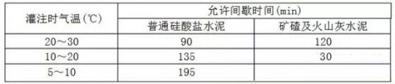 ⑺混凝土澆筑必須連續(xù),因施工需要留設(shè)施工縫,必須征得設(shè)計同意,并得到監(jiān)理認可。允許間歇時間具體見下表;搗固選用的振搗器,其頻率、振幅、振動速度等參數(shù)視混凝土的塌落度及骨料顆徑而定。