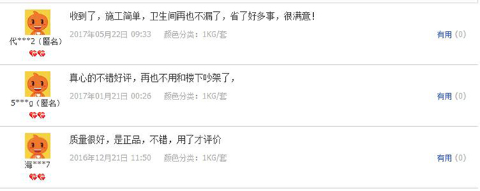 無論是線上客戶,還是線下業(yè)主,使用青龍3號(hào)的業(yè)主都一致地對(duì)青龍3號(hào)的防水性能給給予肯定和好評(píng)。其針對(duì)衛(wèi)生間滲漏的防水效果也讓其它產(chǎn)品自愧不如。