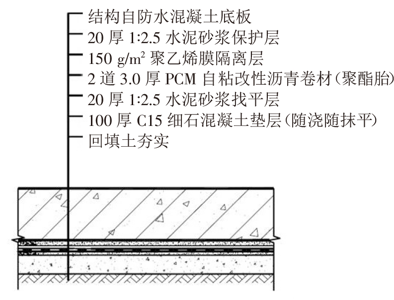 防水卷材選用本公司生產(chǎn)的3.0mm厚PCM自粘聚合物改性瀝青防水卷材(PY類)。該卷材是通過在樹脂和合成橡膠改性瀝青中加入少量活性成分,以聚酯胎作為胎體,以PE膜為表面材料,結(jié)合硅油隔離膜制備而成的防水卷材。該卷材具備較強(qiáng)的基層防竄水性能,卷材中的高分子材料可與基層粘接劑中的高分子和無機(jī)膠凝材料構(gòu)成界面互穿網(wǎng)絡(luò),能有效避免防水層出現(xiàn)整體失效的情況。材料可冷施工,無火災(zāi)隱患,不會(huì)污染環(huán)境,可直接在潮濕的基面上進(jìn)行施工,基層無需做找平層,施工工藝便捷。另外,防水材料有較好的穩(wěn)定性、延伸性、耐腐蝕性和耐候性。