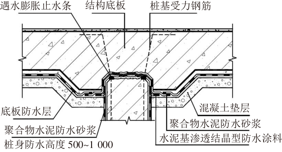 施工時(shí),先對基層進(jìn)行清理,保證基面無灰塵、浮砂、雜物和明水;陰陽角用水泥砂漿抹成圓弧,然后對樁頭采用滲透結(jié)晶型防水涂料進(jìn)行涂刷,用量為1.5kg/m2左右,并將樁頭上的砂眼和細(xì)小縫隙用防水涂料密實(shí)。同時(shí),在樁頭四周300mm左右范圍內(nèi)涂刷聚合物水泥防水砂漿作為過渡層(圖9)。