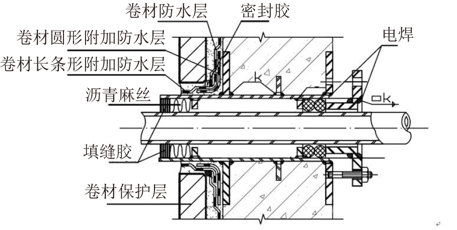 管道、線纜等存在更換需求,需用套管式防水設(shè)計(jì),套管加焊止水環(huán)。套管與管道或線纜之間不得承受水壓,應(yīng)在節(jié)點(diǎn)的外部設(shè)置集水井。室內(nèi)套管的一端應(yīng)與外墻平齊,澆筑混凝土?xí)r端口預(yù)留的套管需密封,防止堵塞孔洞。室外套管突出外墻至少150mm,在外墻模板上定好預(yù)留穿墻管位置并開洞,外墻合模之前把套管放入模板洞中固定好,合模后再密封穿墻管與模板之間的間隙。管道與套管之間的間隙用柔性材料填充,保證端面光滑,同時(shí)管道的接口不得設(shè)置在套管內(nèi)。當(dāng)?shù)叵滤惠^高時(shí),需在套管周圍設(shè)緊固裝置來確??p隙的填充料密實(shí)和不發(fā)生位移(圖7)
