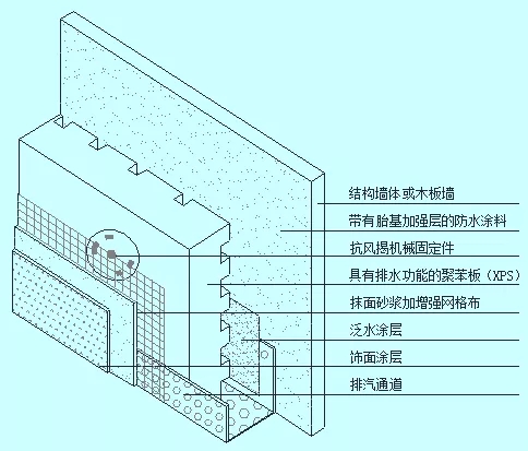 1、國外雙墻結構比較多,外墻漏水會延著空腔往下流,由出水口流至外面;另外一種就是通過有排水功能的聚笨板將水排到地面。